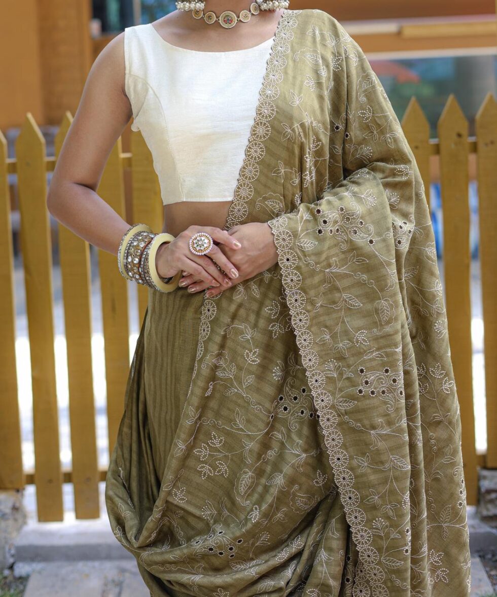 Pure Soft Silk Saree with thread handwork, floral, and cutwork design. Elegant all over. Priced at ₹4,899.00.